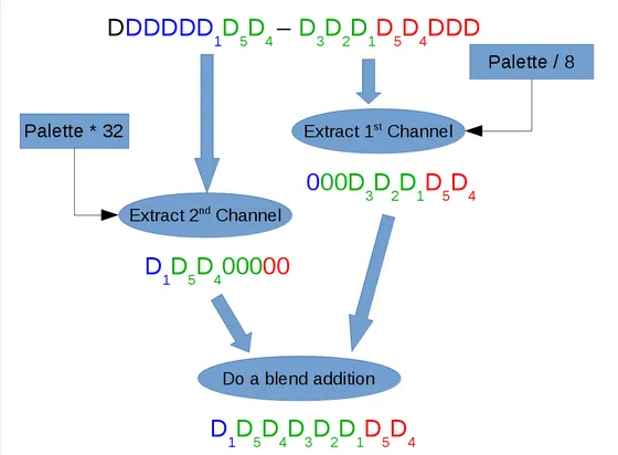 At the top of the drawing, you have the 16 bits depth. The GS will read it as a color texture (aka RGB5A1) so I set some nice colors for the red, green and blue channels. The depth is split into two 8 bits channels, be aware it doesn't map with the color channel because the effect works on 32 bits memory format. I know it's a bit confusing. Anyway the first step will be to extract the first 8 bits then apply a division by 8. Which is equivalent to removing the 3 bits of the right. The second step will be to extract the remaining 8 bits then apply a multiplication by 32. It's equivalent to shifting the data to the left 5 times. The last step is a blending addition between the 2 shifted depth colors and we are done. We managed to extract only the interesting bits of the depth. The new texture could be used to modulate any effects based on depth information.
