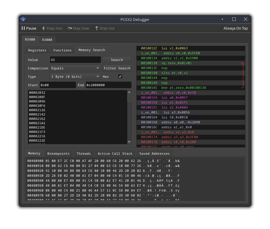 It started as a fresh coat of paint. Paint turned into more register views. More register views turned into more breakpoint features. More breakpoint features turned into memory searches. To top it all off, those of you interested in the lesser of the two main CPUs in the PS2, the IOP, will be pleased to find native support for exported function symbols in the debugger. The PCSX2 debugger is now a wonderfully rich companion for anyone trying to debug PS2 games in real time.