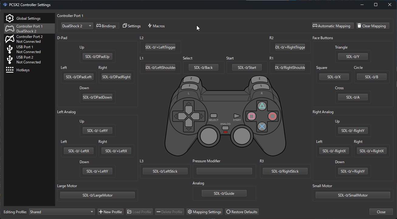 By default, two controller ports are available for mapping. Controller Port 1 and Controller Port 2 will correspond to the controller ports on the front of the PS2 console. Games will almost always expect the first player to use Controller Port 1; make sure you map this controller port first, before moving on to map a second device into Controller Port 2.