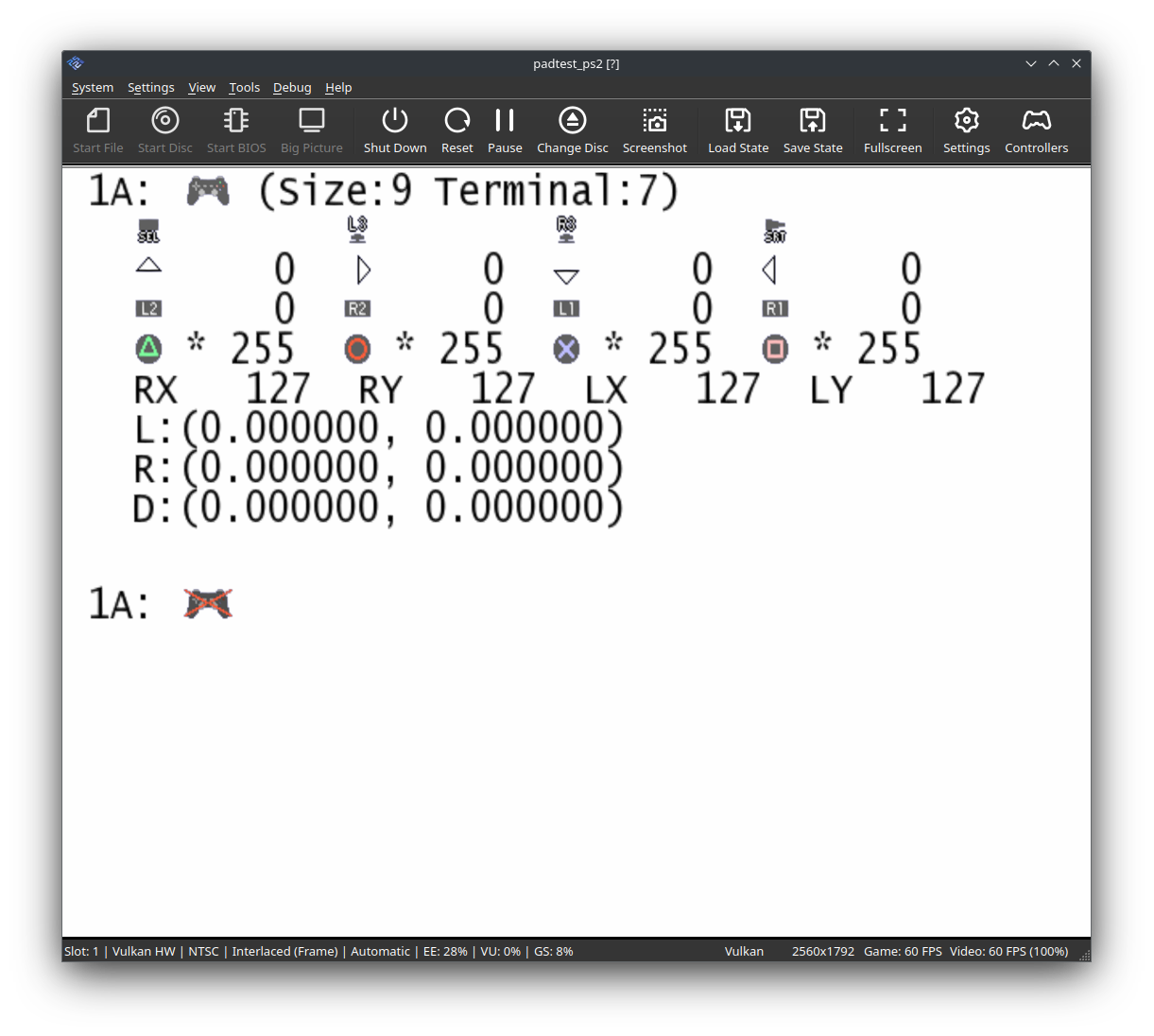 To test your controller mappings, you can use the following PS2 Pad Test homebrew application. Download it, and either drag and drop it onto the main PCSX2 window, or add it to one of your games folders and refresh your games list.