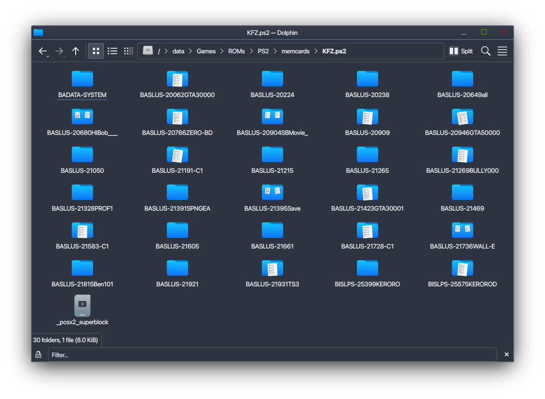 Folder Memory Cards are a little different from File Memory Cards. Instead of storing all the save data inside a single monolithic .ps2 file, they store all saves data inside a folder on the host's file system.